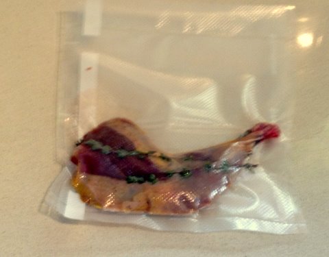The legs I rubbed with salt and freshly ground black pepper and sealed into a sous-vide bag with a few sprigs of thyme. I then cooked them sous-vide for 5 hours on 75C/167F. To get even more of a confit style you could cook it for 10 hours or more, but I did not have time for that this time.