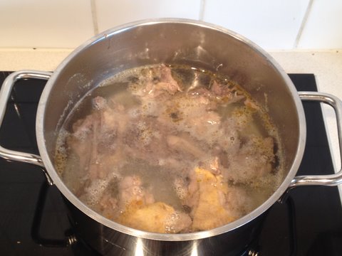 First I cut up the carcass into some pieces and soaked them in cold water to remove any blood.