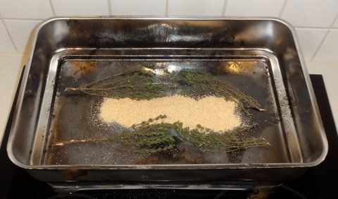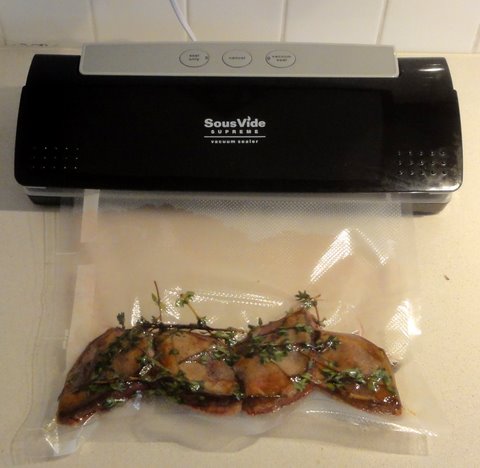 When the pigeon breast fillets have cooled completely, seal them with some thyme sprigs in a vacuum bag. Add any juices that leaked onto the plate to the pigeon stock. Cook sous-vide for 1-2 hours at 54.5C/130F. (You might be able to achieve a similar result using an oven at 65C/149F and a meat thermometer. Cook the breast until the thermometer shows 55C/131F.)
