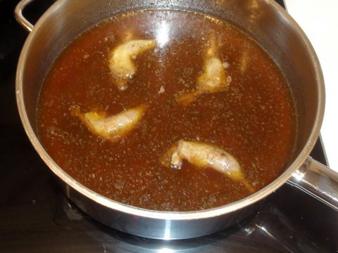 Sieve the pigeon stock into a frying pan. Add the pigeon legs and bring to a simmer (make sure it doesn’t boil). The pigeon legs will be stewed in the pigeon stock, and the stock will thicken. This will take 3 hours or more.