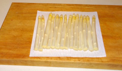 Cut about 1 cm (1/2 inch) off the end of each asparagus and peel them (don’t peel the tip). Dry them with paper towels and sprinkle with salt and freshly ground white pepper.
