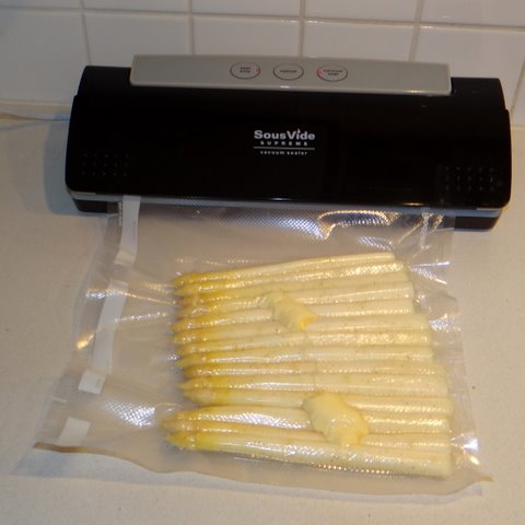 Seal asparagus into a pouch with 2 tbsp of butter. The vacuum sealer will suck moisture out of the asparagus. To minimize this, put the asparagus in the pouch as shown and leave a longer ‘sleeve’.  Cook sous-vide for 45 minutes at 84C/183F. If you’d like to serve the dish with potatoes, you can cook the potatoes simultaneously sous-vide.
