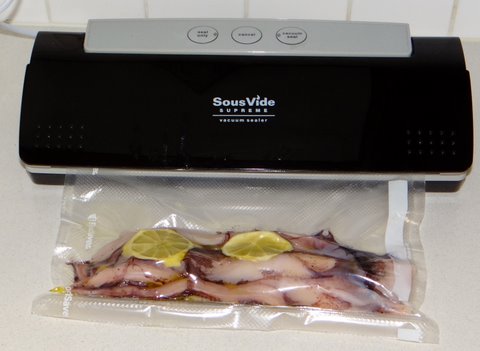 After cooking there was a lot of liquid in the bag. This is normal and the octopus was juicy all the same. You could reserve the liquid for some other purpose (sauce, soup, risotto).