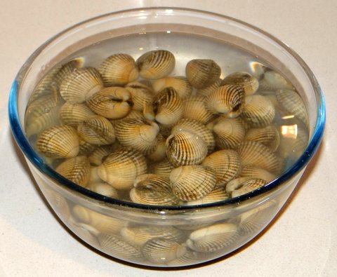 Put about one liter (1 quart) of cold water into a bowl and add enough salt to make it as salt as the sea (3% by weight). If you have any actual seawater on hand, that would be even better 🙂 Put in the clams and let them do their thing for about an hour. If you bought fresh clams, they are still alive and they will clean themselves as you will see. This removes some sand and other stuff you’d rather not eat from the clams.
