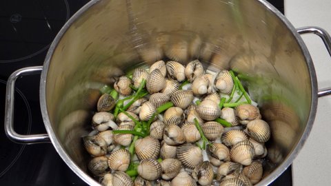 Add the clams. Cover the pot and cook over high heat for a few minutes until the shells are open. Don’t cook longer than necessary, because that will make the clams tough.
