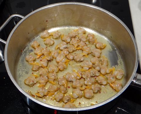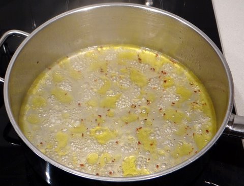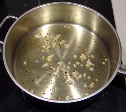 Meanwhile, heat some extra virgin olive oil in a frying pan and add minced garlic and ground chillipepper. Sauté over low heat, don’t let the garlic turn golden (and certainly not brown).