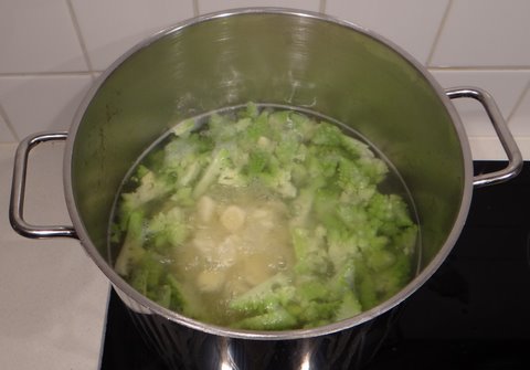 Cook the pasta all dente according to the instructions on the package and cook the romanesco florets in the same pot for 8-10 minutes.