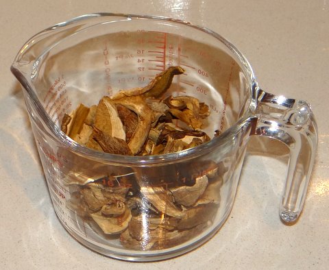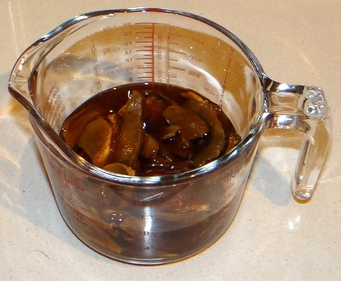 Put the dried porcini mushrooms in a container and bring a cup of water to a boil.