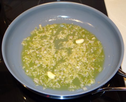 Heat a generous amount of oil in a frying pan over medium heat and sauté the chopped shallot with the whole clove of garlic. Optional: add a chopped slice of prosciutto di parma for additional flavor.
