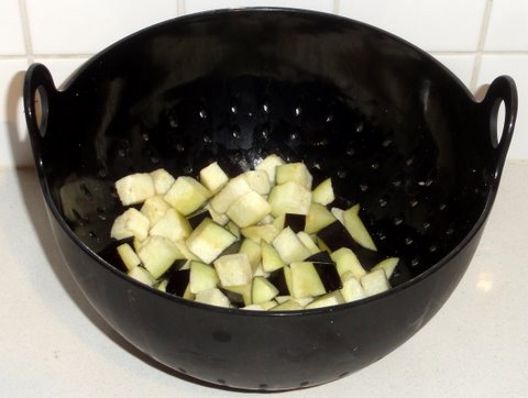 Put eggplant cubes into a colander. Sprinkle with salt.