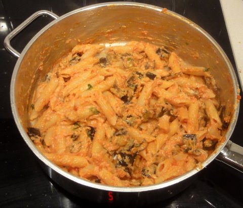 Add the eggplant to the tomato sauce. Drain the pasta and add to the tomato sauce. Add most of the basil. If using ricotta salata, grate and add 3/4. If using normal ricotta and parmigiano or pecorino, add all of the normal ricotta and half of the grated parmigiano or pecorino.