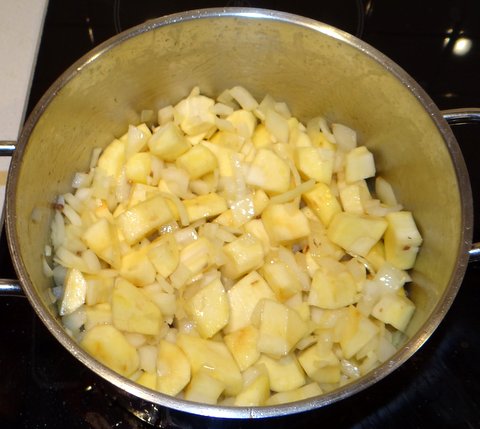 Season the beef cubes with salt and pepper and sprinkle with flour. My beef came with a nice layer of fat that I trimmed and rendered to use the rendered beef fat for browning the beef for additional flavor. You could also just use some olive oil. Heat the oil or beef fat in a casserole (35aweek’s recipe uses a Dutch oven, but although I am Dutch I have no clue what this — go figure!). Brown the beef cubes on all sides and take out of the pan. Preheat the oven to 160C/325F.