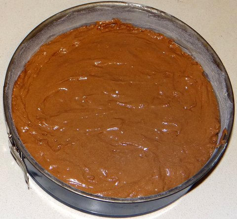 Butter and flour a 24 cm/9″ springform pan. Pour the batter into the pan and flatten the top with a spatula. Bake for 45 minutes at 180C/350F until a tester comes out clean.