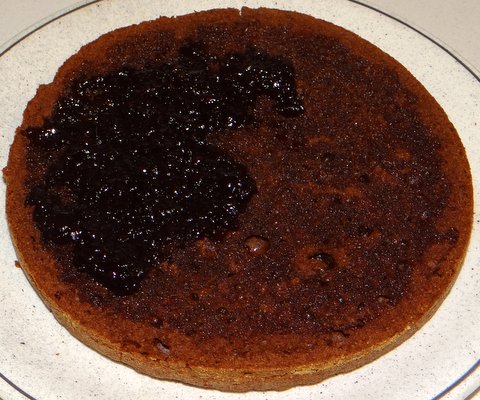 Cut the cake base into three discs. Start with the bottom disc. Measure 140 ml of the cherry syrup and mix it with the kirsch. Sprinkle this liberally over the cake disc, making sure that the cake is evenly soaked. Spread out half the cherries onto the disc.