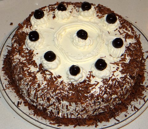 Decorate the cake with the chocolate shavings, whipping cream and the reserved cherries.