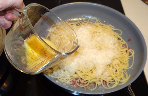 Beat the egg and the egg yolk with some freshly ground black pepper. When the spaghetti is done, add it to the pancetta or guanciale, add about 2/3 of the grated cheese and turn off the heat. Now add the beaten egg and toss to mix. The trick is to get the temperature of the pan and the spaghetti just right before adding the egg. The pasta should be warm enough to slightly cook the egg so it will thicken, but should not be so hot that the egg will scramble.