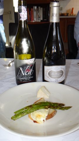 Most people, including myself, found this the best match. This time we had the same Sauvignon Blanc from New Zealand but a different Sancerre from Henri Bourgeois: La Bourgeoise 2007 instead of Mont Damnés 2009. Since 2007 was a cool year, La Bourgeoise 2007 was still a bit young and therefore Le MD de Bourgeois we had last time was better as a wine. The match was still fine, also with the roasted green asparagus. (Tossed with olive oil, salt and freshly ground black pepper and roasted for 20 minutes in a 225C/440F oven.) We had the same goat cheese as last time, with the raw-milk Chevre d’Or still being one of my favorite cheeses.