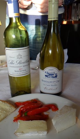 We had the same South African Chardonnay-Semillon as last time, but a different white burgundy because I had run out of the one we had before. The Mercurey 1er Cru Saint Morilles 2009 from Domaine Berthenet we had this time was still a bit young but already had a beautiful minerality going on in the nose. The raw-milk Brie de Meaux was a good match with this wine, whereas the Pierre Robert was good with the South African. The roasted peppers were a good combination. (To roast the peppers, brush with olive oil and roast for 25 minutes at 250C/480F. It’s easy to peel them as soon as they have cooled off. Serve marinated with extra virgin olive oil, salt, freshly ground black pepper and fresh basil.)