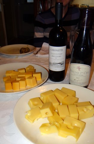 Same cheeses as last time, but slightly different wines. The matches worked out the same: young Gouda from the Beemster matched best with Chionetti Dolcetto di Dogliani Briccolero 2009, and the Emmenthaler matched best with the red Burgundy, Rossignol Trapet Beaune 1er Cru Les Teurons 2007. The burgundy had a beautiful nose.