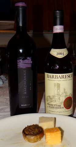 Again same cheeses with different wines. The Barbaresco 2004 from Produttori del Barbaresco was outstanding after it had been hyperdecanted. This Barbaresco from 2004 is definitely ready to drink and seems to be at its peak. Good match with the Parmigiano Reggiano. The Vinosia Marziacanala 2005, an Aglianico from Campania (Italy) was also outstanding and didn’t even need decanting. It was great with the aged Gouda from the Beemster. The stuffed mushrooms were especially good with the Barbaresco. (Sauté chopped mushroom trunks with chopped flatleaf parsley and minced garlic. Mix with grated parmigiano reggiano, bread crumbs, an egg and season with salt and pepper. Stuff the mushrooms with this mixture and bake for half an hour or so at 180C/355F.)