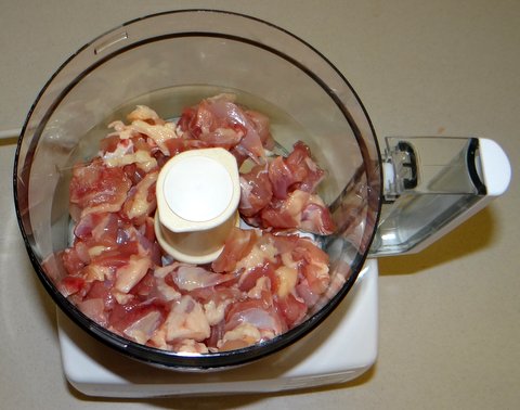 Meanwhile, if using chicken thigh meat, cut the meat into pieces and put into the food processor.
