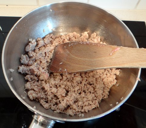 Add 1/4 tsp salt, 2 Tbsp sugar, 3 Tbsp Japanese soy sauce, pan-cooked meat and 1 tsp fresh ginger juice to the mixture, mixing well between additions.
