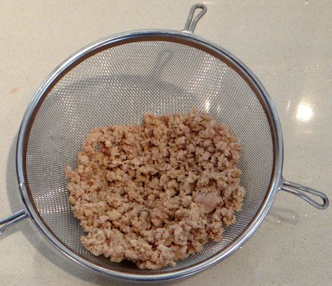 Spread in a sieve or colander to drain and cool. Tsuji advises to precook half the meat this way to keep the whole loaf from shrinking during baking.