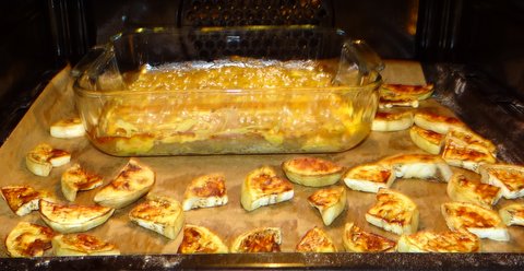 Bake/roast the meatloaf and eggplant for 30 minutes at 225C/440F. Turn the eggplant slices halfway. After 25 minutes, brush the top of the meatlof with the remaining egg yolk and sprinkle with sesame seeds (preferably toasted).