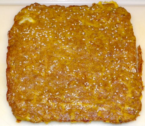 Brush a baking dish (approximately 20 x 20 cm or 8″ by 8″) with sesame oil. Spread the meat mixture into the baking dish. Preheat the oven to 225C/440F.
