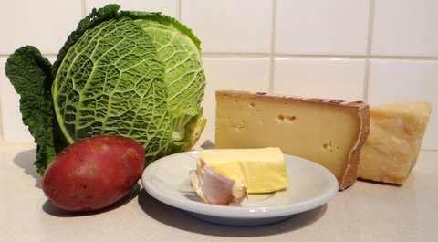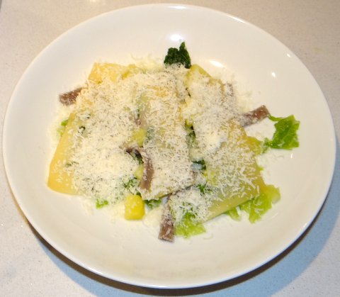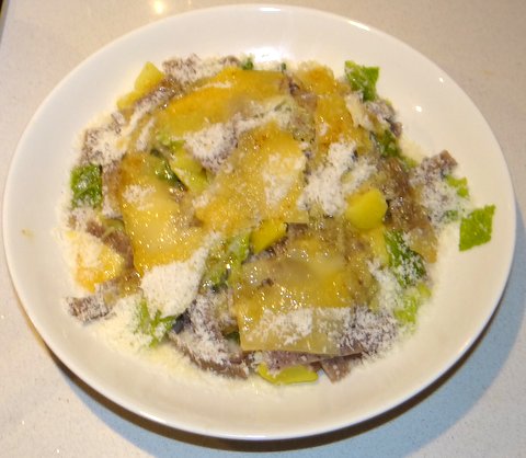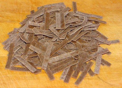 Pizzoccheri are a short and flat type of pasta from the Valtellina region in Northern Italy, made from buckwheat and semolina flour. You can buy them dried or make them yourself (something I might try another time). They are traditionally eaten with swiss chard (coste) or savoy cabbage (verza) and the local cheese: valtellina casera. This cheese is important to get the authentic taste, but if you can’t find it then fontina can be used as a substitute. This is the only traditional pasta dish that I know that has cabbage in it. Unlike other pasta dishes that are supposed to serve as part of a menu, pizzoccheri are typically served as piatto unico, a full meal consisting of just this done dish. I made it for the first time and liked it. I used the recipe printed on the package, but increased the amount of vegetables as per other recipes found online.