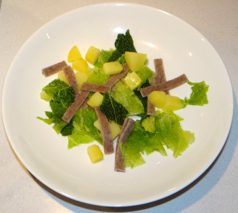 Peel the potatoes and cut into cubes (about 1 cm or 1/3 inch). Remove the large veins from the cabbage (you should have about 125 grams or 0.28 lbs left) and cut the leaves into pieces (about 2 cm or 1 inch).