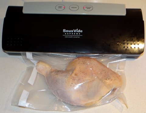 But I wanted to see if I could create something like my grondmother’s petroleumstel chicken by cooking the leg of a stewing hen sous-vide. So I seasoned two legs with salt and freshly ground black pepper and sealed them into individual pouches, skin on. I then cooked them at 64C/147F, the regular temperature for chicken legs. But instead of the usual 2 to 5 hours, I tried the first leg after 24 hours. It was edible but still way too tough, so I decided to leave in the second leg for 72 hours (i.e. 3 days) total.