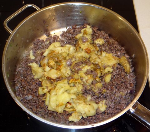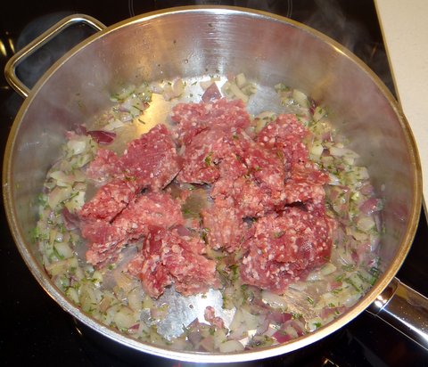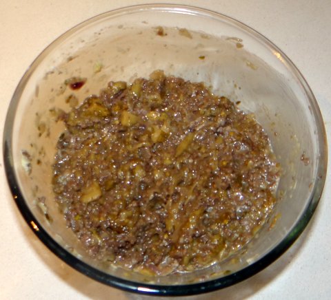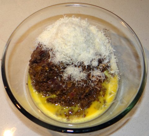 Put an egg in a bowl and beat lightly. Add the meat and 4 Tbsp freshly grated sheep’s cheese.