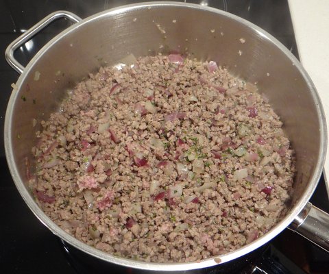 Add the pulp including the eggplant juices to the meat and cook, stirring, until the liquid has evaporated. Let cool to lukewarm. Taste and adjust the seasoning with salt and freshly ground black pepper. It should be slightly on the salty side at this point.