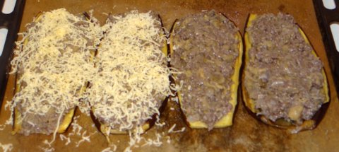 Stuff the eggplant skinds with the mixture, and sprinkle with more freshly grated sheep’s cheese.