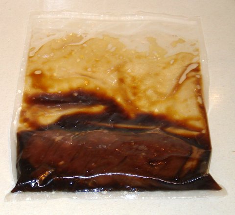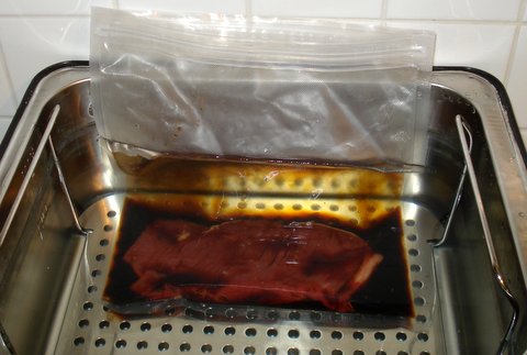 Put the beef and the teriyaki marinade in a ziploc sous-vide pouch. Seal it with as little air as possible using the water displacement method (i.e. submerge the bag while pushing out the air and seal the ziploc just before it goes under water). Cook sous-vide for 1 hour at 50C/122F.