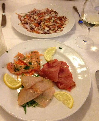 We really liked the fish antipasti. Cold cuts of smoked marlin with arugula, smoked tuna with tomato, and salmon with carrot. Served with good extra virgin olive oil and slices of lemon. Octopus carpaccio served with extra virgin olive oil, parsley, lemon and chopped fresh tomato.