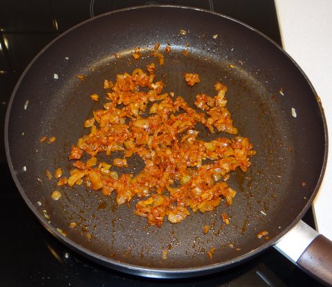 Sauté the onion with the garlic, half the ginger and the shichimi in the oil until translucent. Add tomato paste and stir to mix.