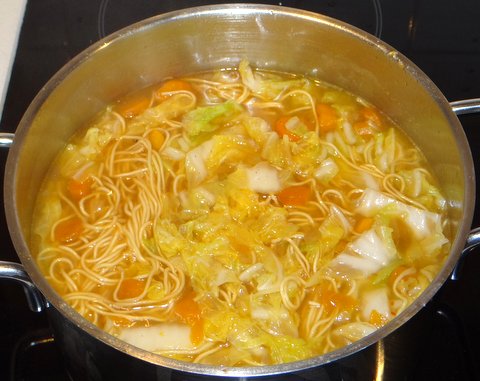 Add noodles and cabbage and cook for about 4 minutes (check the noodle package for instructions).