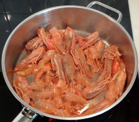 Sauté the heads and shells in 2 Tbsp olive oil until pink.