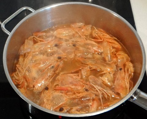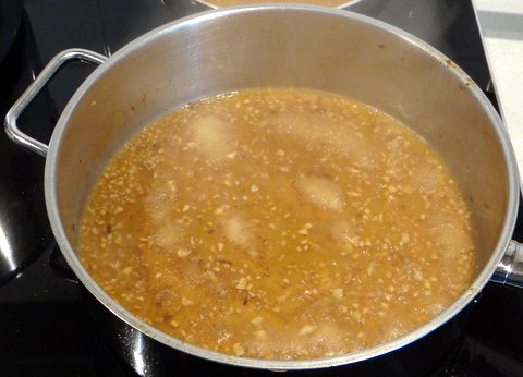 Let the shrimp stock reduce to about 4 Tbsp in a saucepan over medium heat.