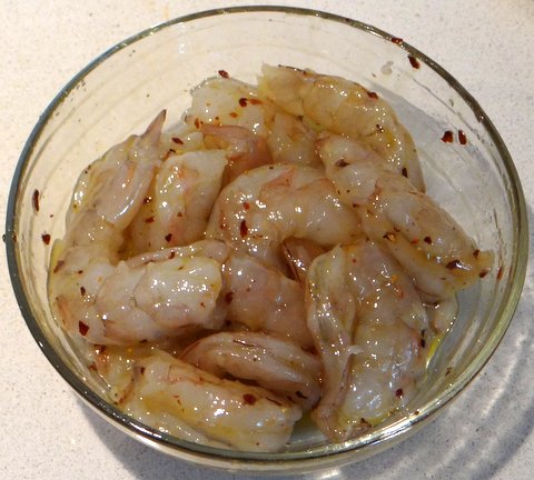 Peel and devein the shrimp, reserve heads and shells. Put the shrimp into a bowl with 2 Tbsp olive oil, salt and red pepper flakes. Mix and refrigerate until needed.