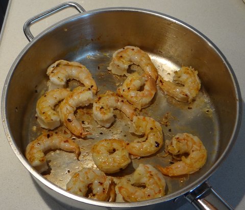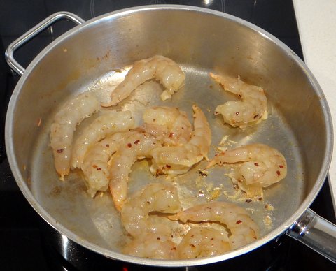 Heat a frying pan. When it’s hot, add the shrimp in a single layer and cook without stirring for a bit less than a minute.
