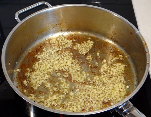 Return the frying pan to the heat. Add 2 Tbsp olive oil and the garlic.