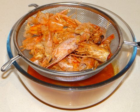 Drain to obtain shrimp stock. Squeeze out the heads to get more flavor.