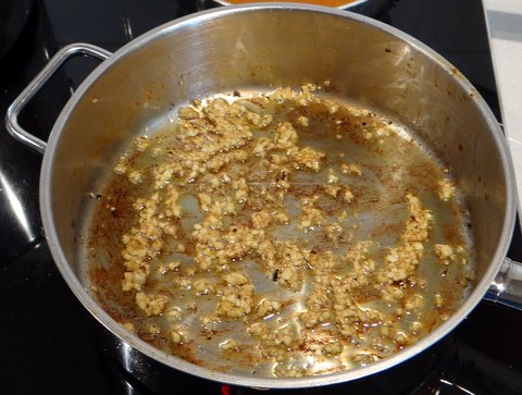 Sauté over low heat until the garlic is golden, 5 to 10 minutes. Do not let the garlic turn brown!