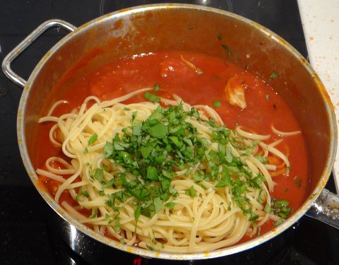 When the pasta is cooked, drain and add to the pan, together with most of the basil.
