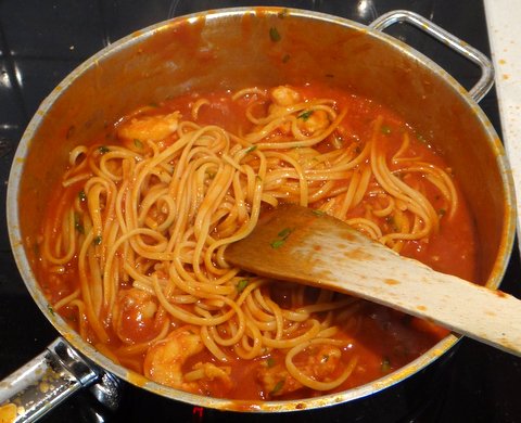 About 1 minute before the linguine are cooked, lower the heat and add the shrimp to warm up.