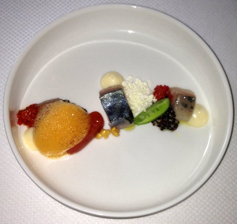 The ‘amuses bouche’ continued with three preparations of bell peppers with very tender slow-cooked mackerel.