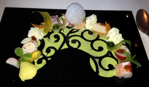 The first course of the menu d’été was the best of the evening: Seafood 2012, marinated seafood with cream of sea weed, lobster tail prepared in citrus oil and ponzu jelly. Amazing presentation and great taste. All the seafood was excellently prepared. Good match with an usually exotic albariño from Rias Baixas. 10/10